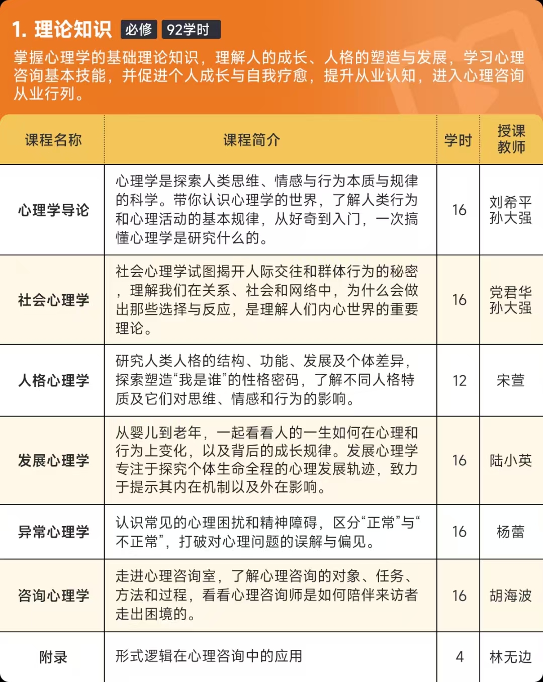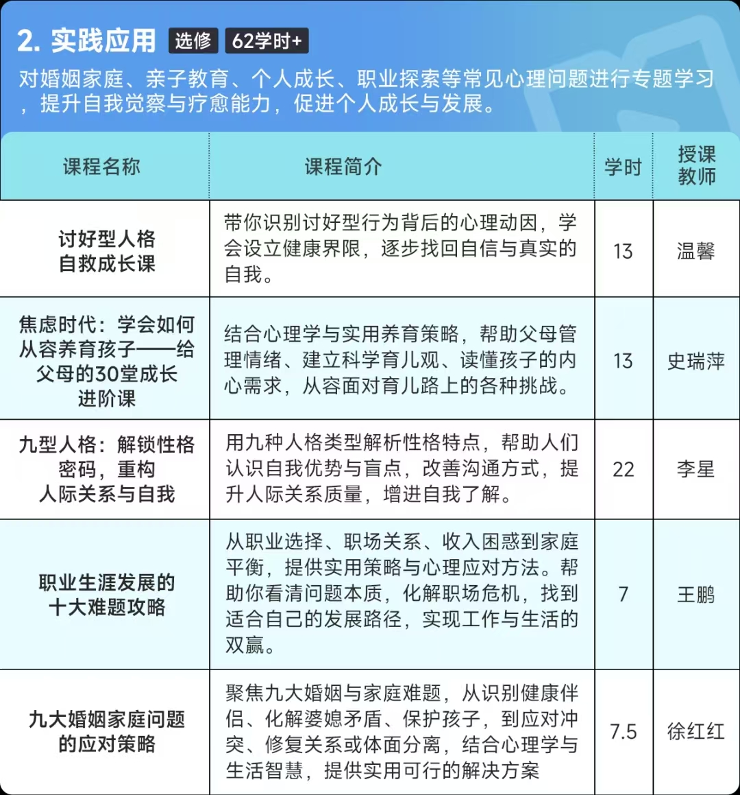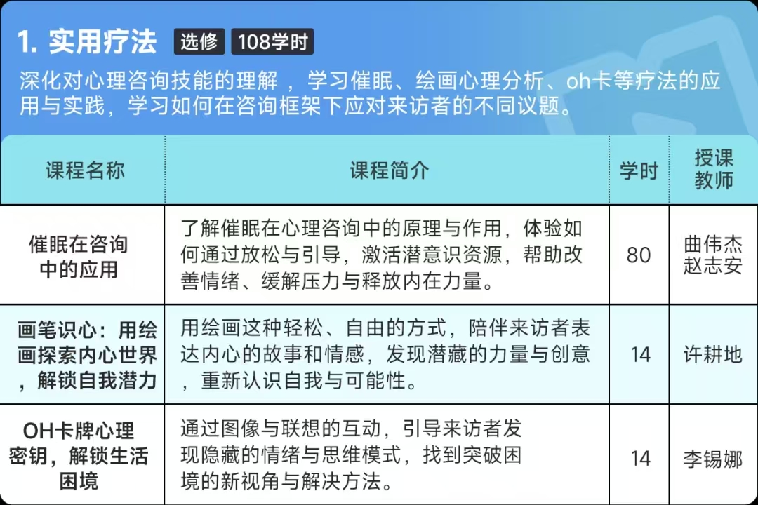 按照心理咨询师成长规律提供了众多增值权益,以补充必修课程中关于咨询实践的疗法和实操技能,其均为心理咨询的必备能力。