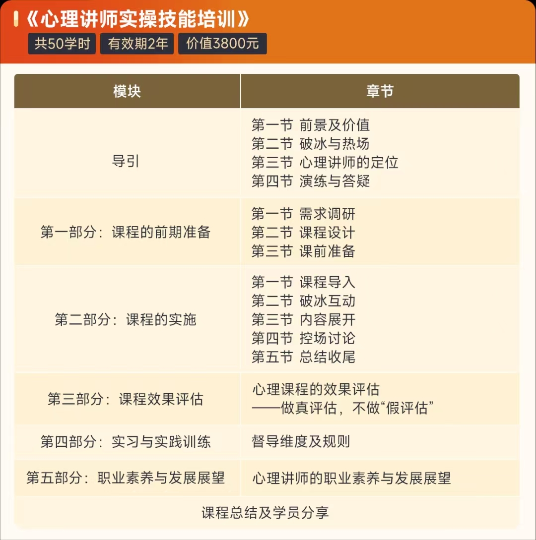 权益一:价值3800元《心理讲师实操技能培训》线上课程,共50学时,有效期2年。