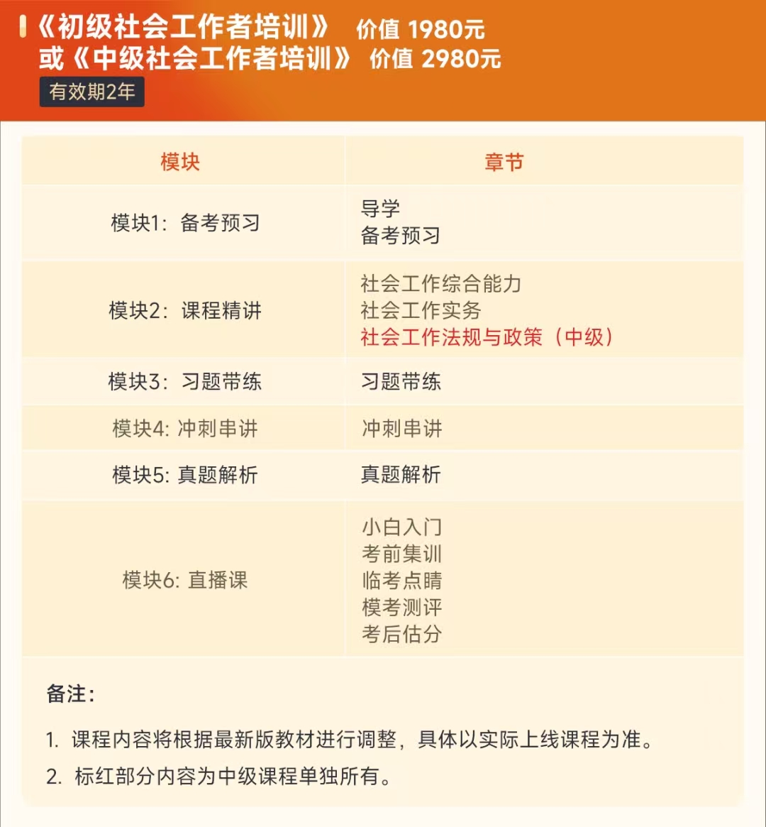 权益二:价值1980元《初级社会工作者培训》或价值2980元《中级社会工作者培训》线上课程二选一,课程有效期2年。