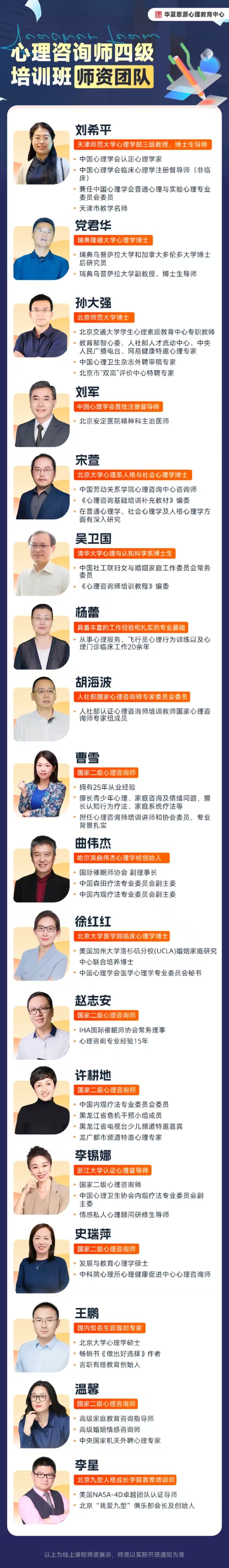 为满足学员需要,华夏思源特举办《心理咨询师(四级)培训课程》,普及心理健康知识和培养心理服务人才,助力心理咨询师爱好者迈出实现职业理想的第一步。