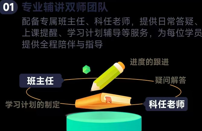 无论是学习计划的制定、学习进度的跟进,还是疑问解答,都有人在身边,帮助你更高效、更安心地学习。