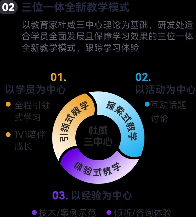 1)引领式教学-以学员为中心:全程引领式学习;1V1陪伴成长